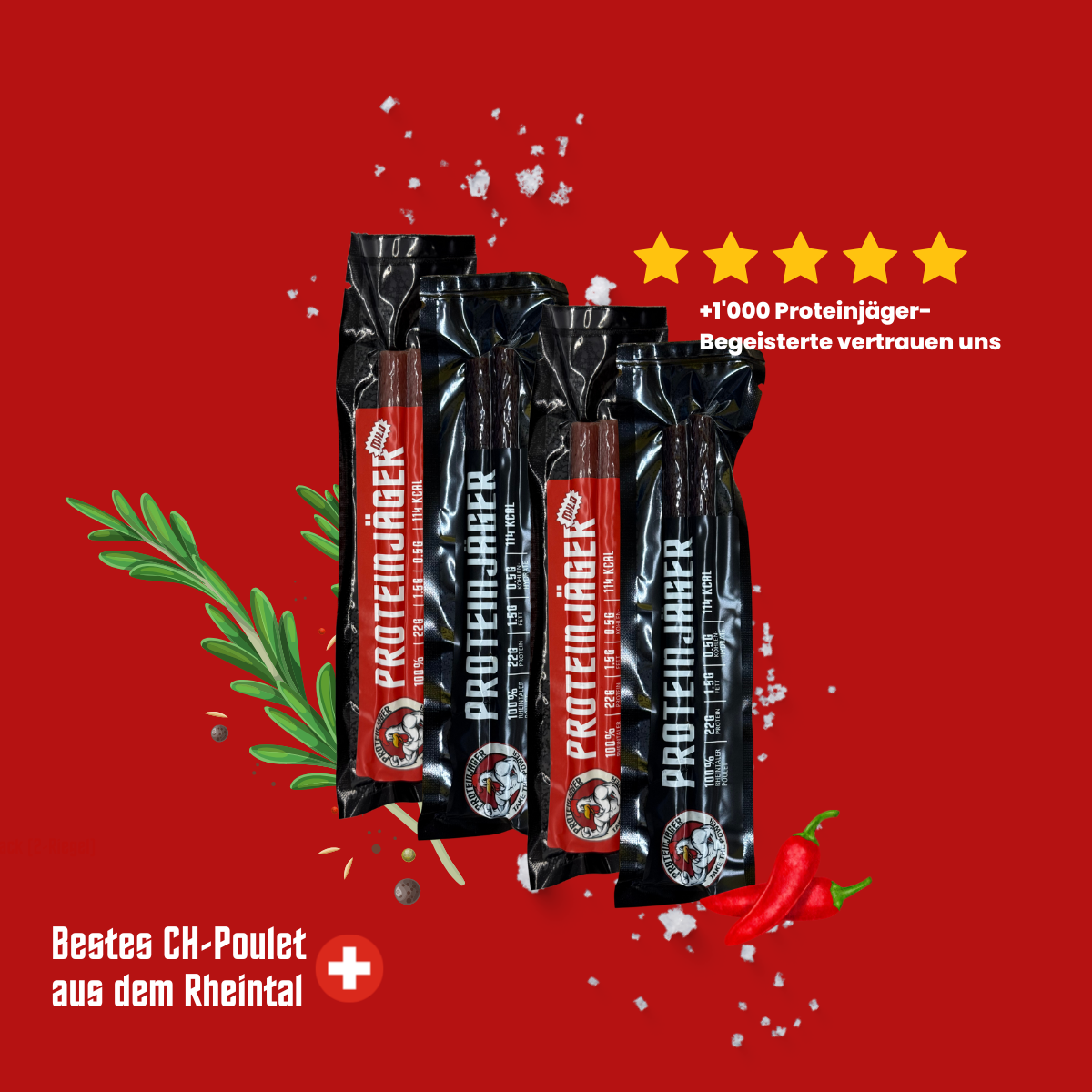 Einzelpreis proDer Proteinlandjäger wird in Heerbrugg in einer kleiner Manufaktur hergestellt. Wir verwenden ausschliesslich Rheintaler Poulet aus eigener Zucht. Damit wir beste Qualität aus 100 % Überzeugung abliefern können.